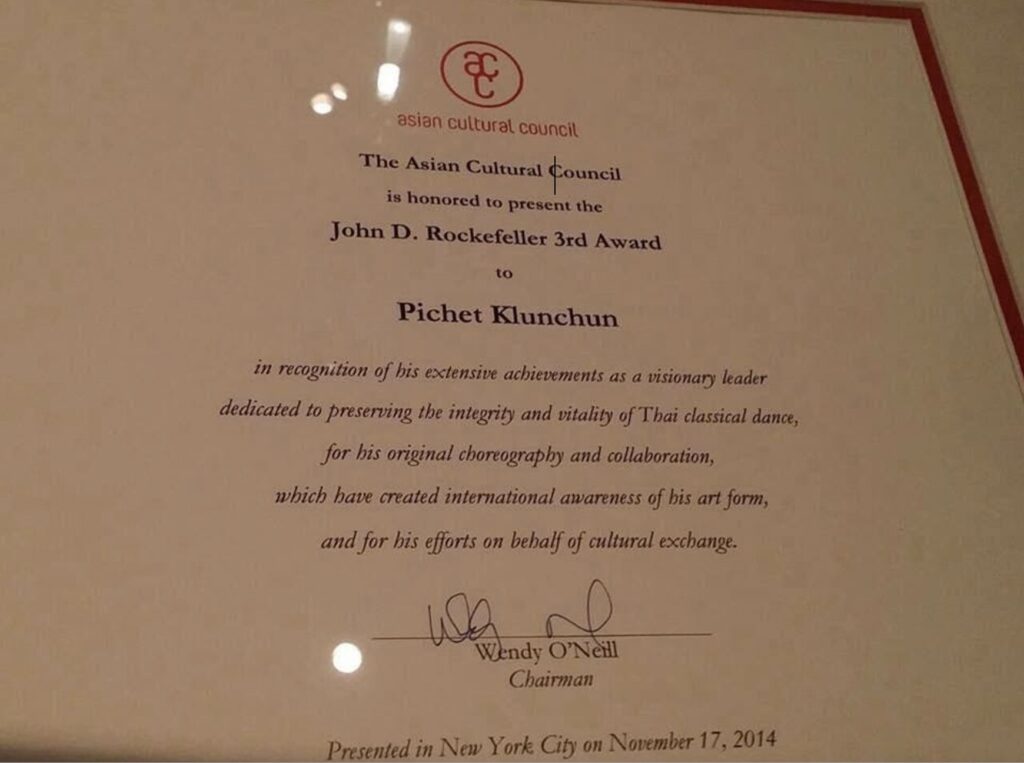ในปีพ.ศ. 2544 เขาได้รับทุนจาก Asian Cultural Council (ACC) ซึ่งได้รับการสนับสนุนจาก Rockefeller Foundation ให้ไปศึกษาและทำงานในสหรัฐอเมริกา ช่วงเวลาดังกล่าว เขาได้สอนนาฏศิลป์ไทยในฐานะอาจารย์รับเชิญที่ UCLA และเข้าร่วม American Dance Festival ณ Duke University ในฐานะนักออกแบบท่าเต้นรุ่นใหม่ ประสบการณ์ครั้งนั้นได้จุดประกายภารกิจตลอดชีวิตของเขา — เพื่อพัฒนาภาษาท่าทางของไทยให้ร่วมสมัยและทรงพลังในเชิงวิพากษ์